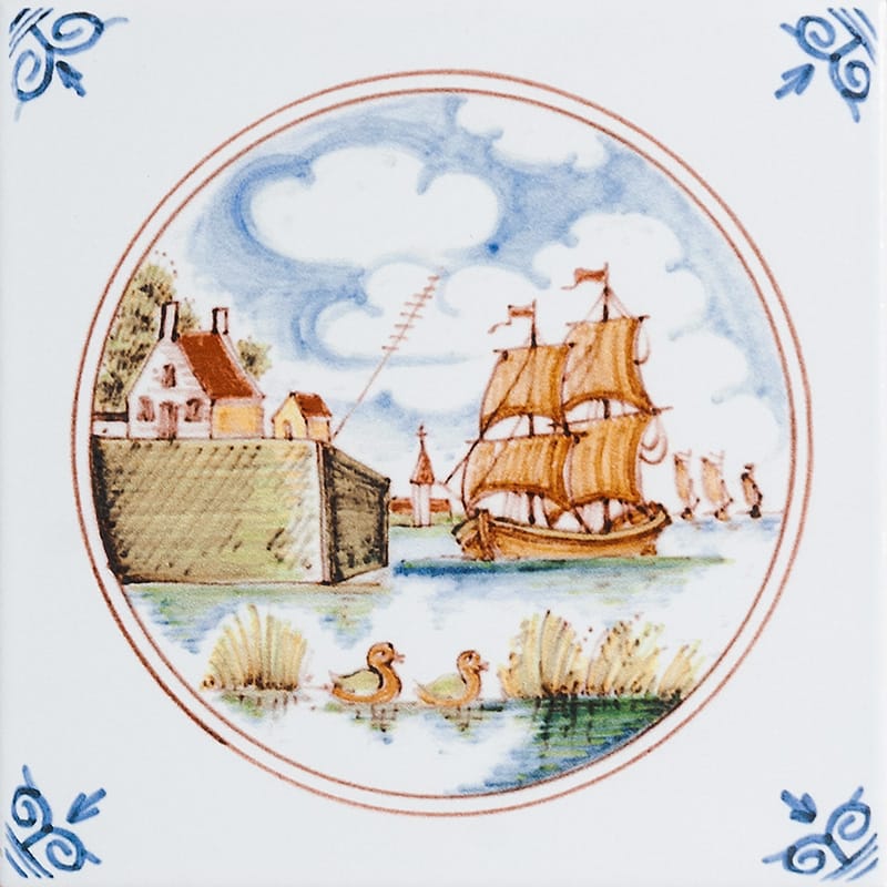 Ship Scene In Circle Glazed Delft Ceramic Tile 6x6x3/8